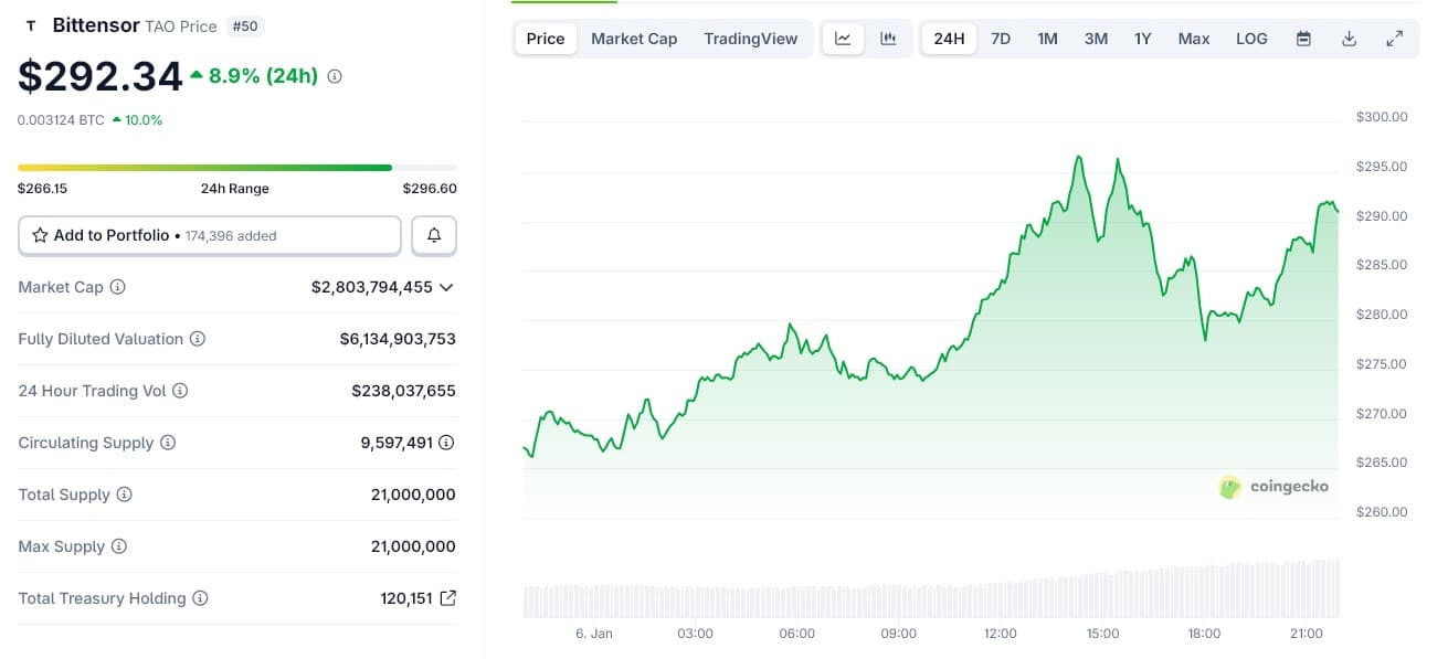 El 6 de enero de 2026, el token TAO de Bittensor registró un aumento de casi el 10 %, superando los 290 dólares, con un volumen de intercambio en 24 horas que superó los 230 millones de dólares. Este rendimiento se explica en gran parte por el anuncio del lanzamiento del GTAO, que estimuló la demanda institucional. Además, la capitalización de mercado del TAO asciende ahora a aproximadamente 2,8 mil millones de dólares con una oferta en circulación de 9,5 millones de tokens.