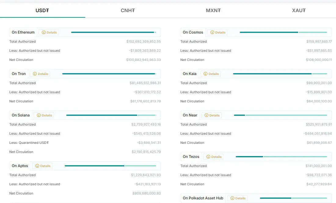 Los datos muestran que Tether tiene una circulación neta de USDT de $100.882 millones, de los cuales $1.809 millones han sido autorizados pero no emitidos, lo que resulta en un suministro total autorizado de USDT de $102.691 millones. Solana ocupa el tercer puesto con un suministro autorizado de $2.740 millones y una circulación neta de $2.190 millones. Aptos Solana sigue con un suministro autorizado de USDT de $1.230 millones y una circulación neta de $808,7 millones.