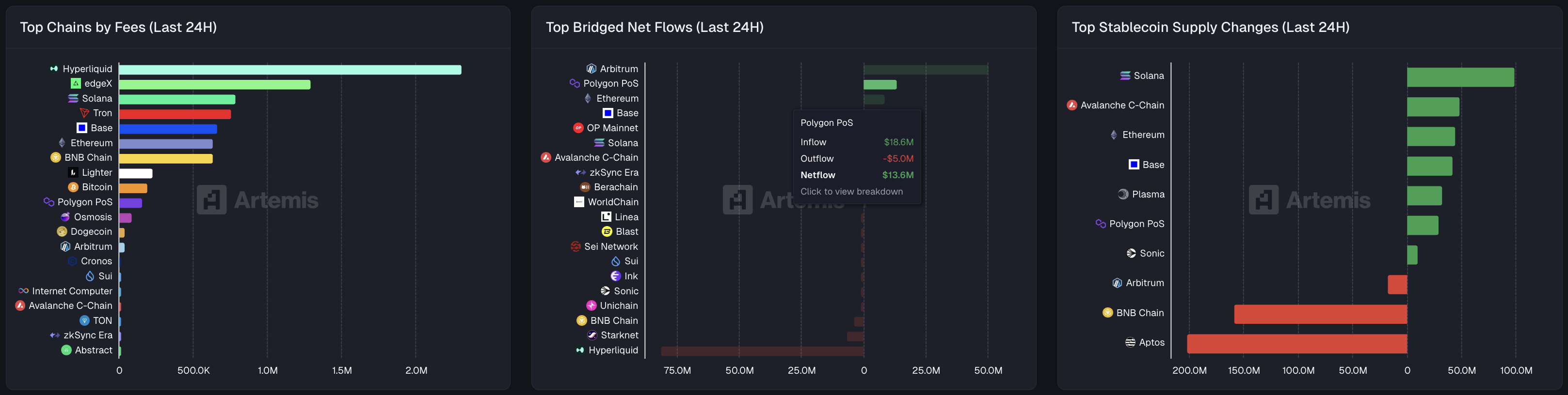 Los datos de Artemis muestran que Polygon registró flujos netos puentes de 13.6 millones de dólares en las últimas 24 horas, solo superado por Arbitrum, que registró 50.4 millones de dólares en flujos netos. Consistente con estas entradas, la oferta de stablecoins de Polygon ha aumentado en 29 millones de dólares durante el mismo período.