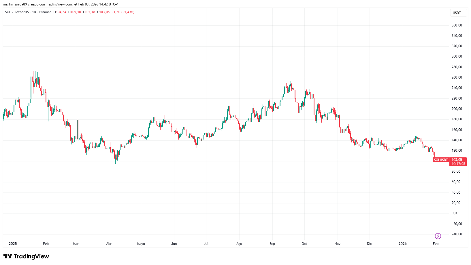 Al momento de publicación de esta nota, $SOL cotiza en torno a 103 dólares, lo que representa una caída cercana del 65% respecto de su máximo histórico (ATH) de 294 dólares, alcanzado el 18 de enero de 2025, tal como lo reportó CriptoNoticias.