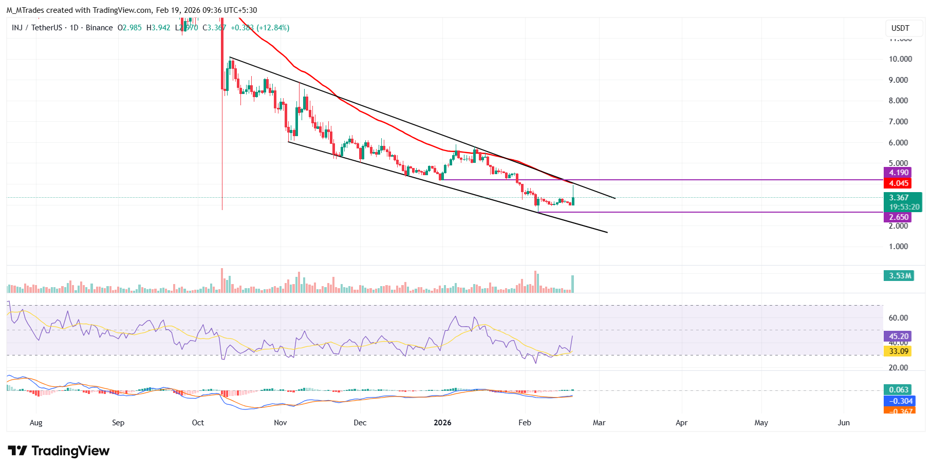 Si $INJ rompe y cierra por encima de este límite de línea de tendencia, podría extender el repunte hacia el nivel psicológico clave en 5$.