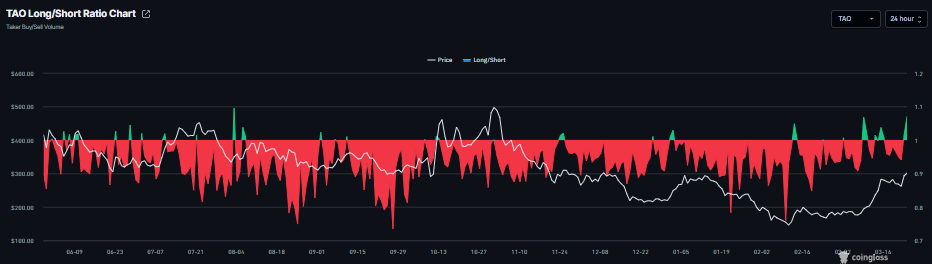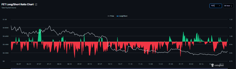 Además, la ratio largo-corto de CoinGlass para $TAO y $FET se sitúa en 1.07 y 1.04, respectivamente. Una ratio por encima de uno indica sentimiento alcista, ya que más operadores apuestan a que el precio del activo subirá.