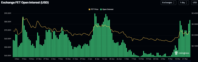 El interés abierto (OI) en CoinGlass para $TAO y $FET aumentó a 371.49 millones de dólares y 82.12 millones de dólares el martes, respectivamente. Para $TAO, el OI actual está en su nivel más alto desde principios de noviembre, mientras que para $FET, está en su nivel más alto desde mediados de enero. Estos niveles crecientes de OI representan dinero nuevo o adicional entrando al mercado y nuevas compras, lo que podría alimentar el actual repunte de precios de $TAO y $FET.