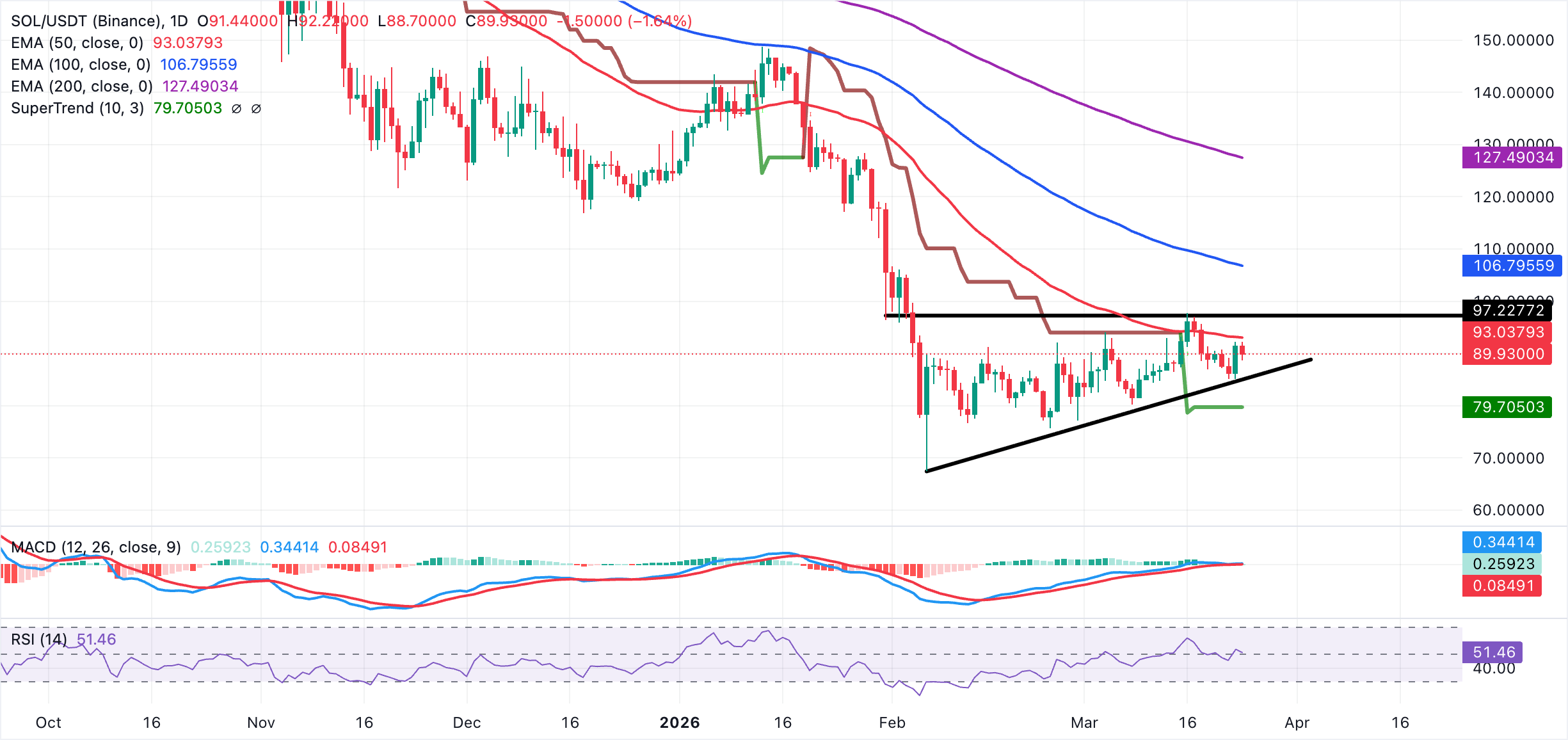 Solana cotiza alrededor de 90.00$ en medio de un sesgo cautelosamente alcista. El precio se mantiene por encima de la línea de tendencia de soporte ascendente que se origina cerca de 67.40$, manteniendo el avance general intacto a pesar de los retrocesos recientes. Las medias móviles exponenciales (EMAs) de 50, 100 y 200 días permanecen agrupadas por encima del precio spot y con tendencia a la baja, lo que podría limitar los rebotes.