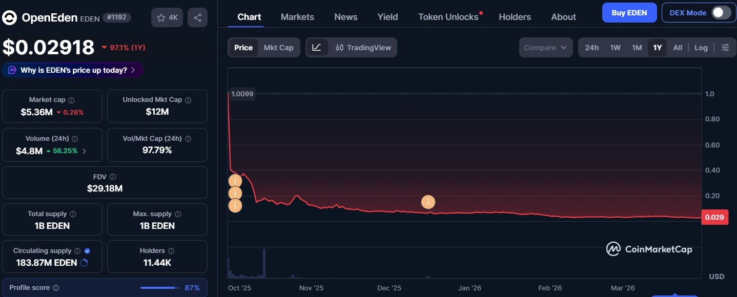 Actualmente, EDEN cotiza a alrededor de 0,029 dólares , lo que representa una caída de aproximadamente el 97 % desde su máximo histórico. Sin embargo, el token no se desplomó debido a una mala gestión ni porque OpenEden no pudiera cumplir sus objetivos.