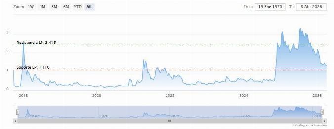 La resistencia a mediano plazo se encuentra en los 1.67 dólares. Mientras, los indicadores de Ei se muestran mixtos.