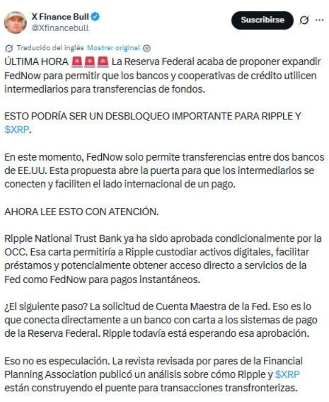 La Reserva Federal (FED) ha dejado un gran anuncio para el sector de las criptomonedas. El analista XFinanceBull reveló en X que la entidad reguladora ha presentado una propuesta para expandir las capacidades de FedNow para que los bancos y las cooperativas de crédito utilicen intermediarios para las transferencias de fondos. Lo que deja a Ripple ($XRP) como un beneficiario oculto ante su actual posición en lo que se refiere a transferencias, según Godspower Owie en News BTC.