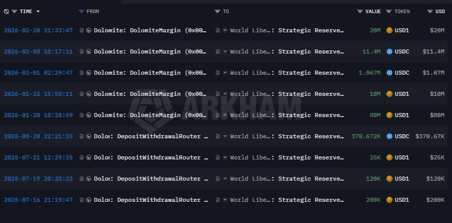 La secuencia que encendió las alarmas comenzó el 8 de febrero de 2026. Según datos expuestos por el explorador Arkham, ese día, la tesorería de World Liberty Financial depositó 14 millones de $USD1, su propia stablecoin, en el protocolo de finanzas descentralizadas (DeFi) Dolomite como garantía y tomó prestados 11,4 millones de USDC. Minutos después, esos fondos fueron enviados a una dirección de Coinbase Prime, una plataforma usada habitualmente para conversión a dinero fíat u operaciones institucionales.