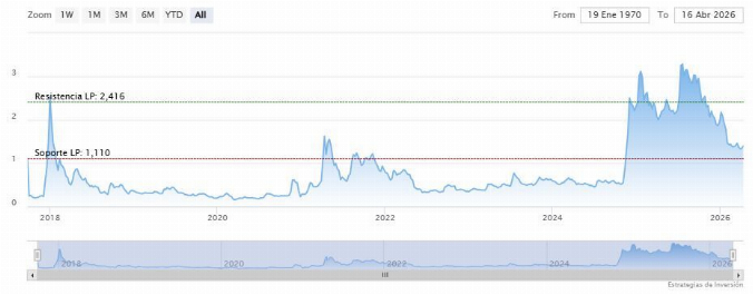 La resistencia a mediano plazo se encuentra en los 1.67 dólares. Mientras, los indicadores de Ei se muestran mixtos.