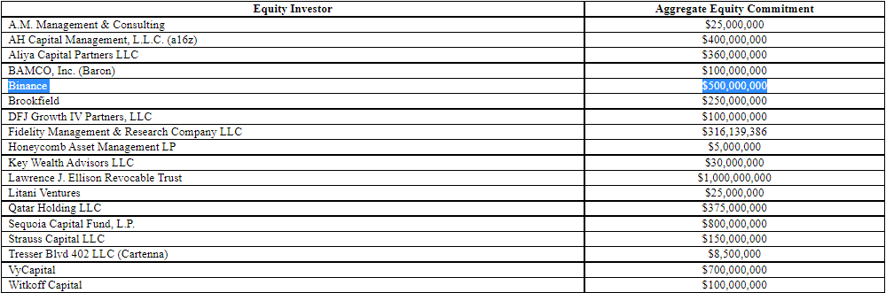 El exchange se comprometió con un aporte de 500 millones de dólares para la compra de la red social de parte del empresario. Esa suma de dinero forma parte de un fondo de unos 7.139 millones que contó con los compromisos de más de una decena de participantes, como muestran los documentos introducidos por Musk ante la Comisión de Bolsa y Valores (SEC) de Estados Unidos.