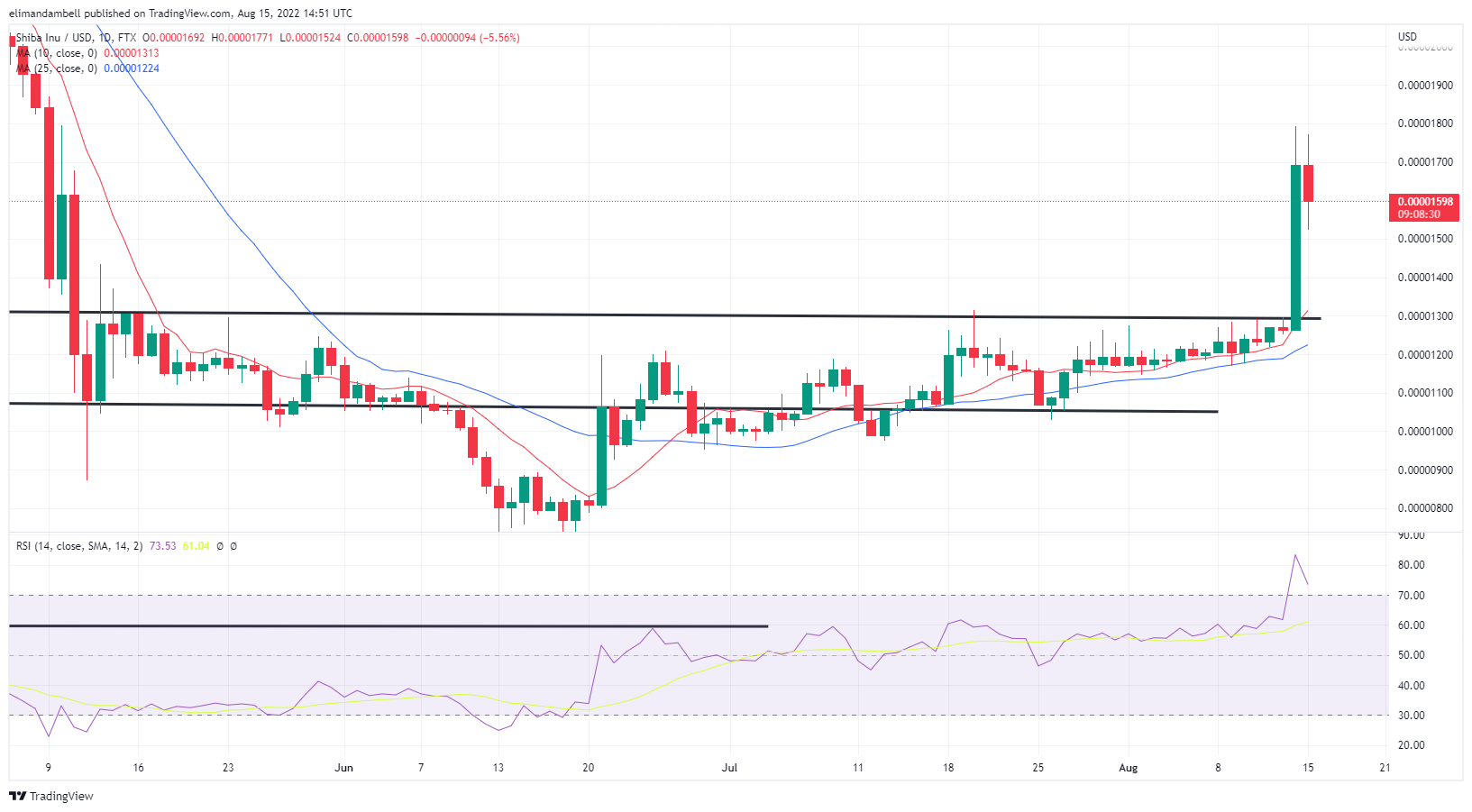 Luego de un máximo intradiario de $0.00001790 el domingo, el SHIB/USD subió a un máximo de $0.00001774 más temprano en la sesión de hoy.