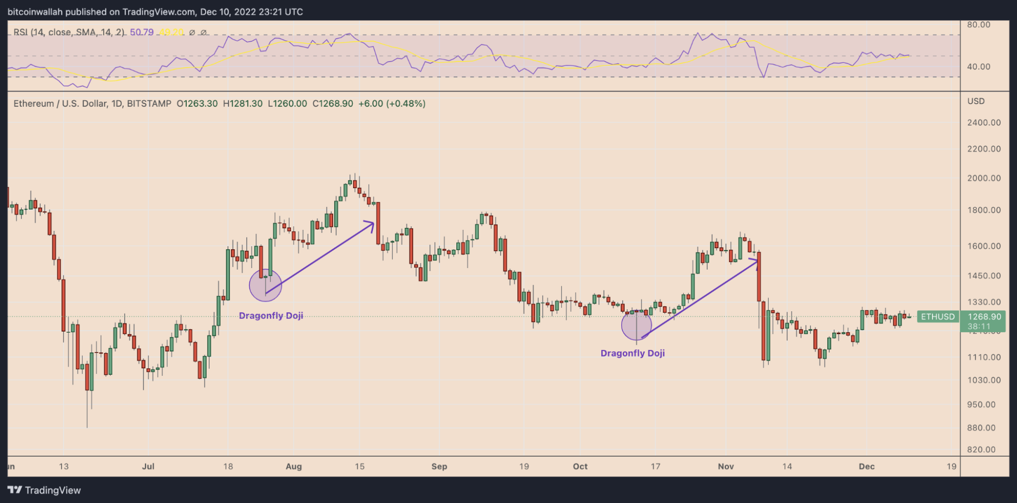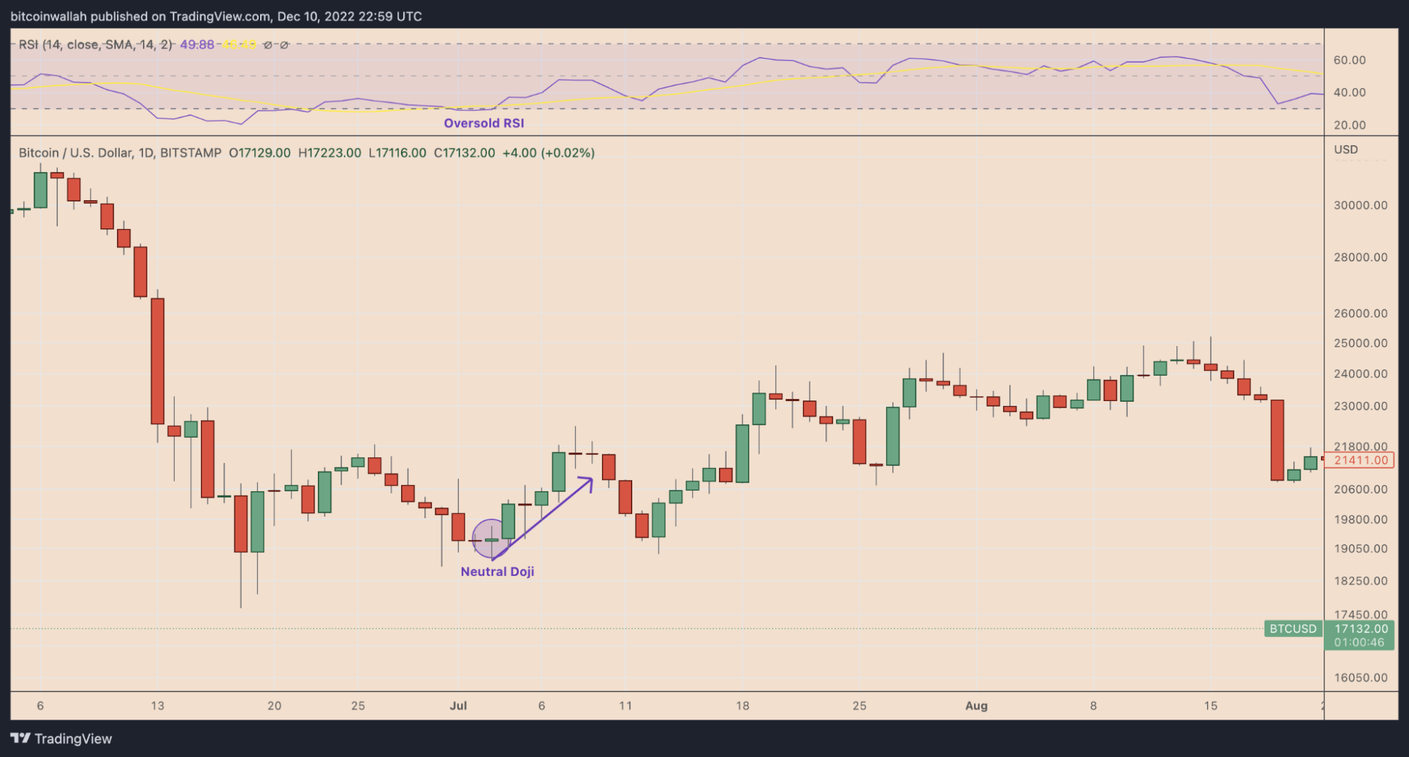 Por ejemplo, la aparición de un Doji neutral en una tendencia alcista coincidiendo con un RSI sobrecomprado (>70) podría indicar una corrección inminente del mercado. Del mismo modo, la aparición de la vela en una tendencia bajista cuando el RSI se ha vuelto sobrevendido (