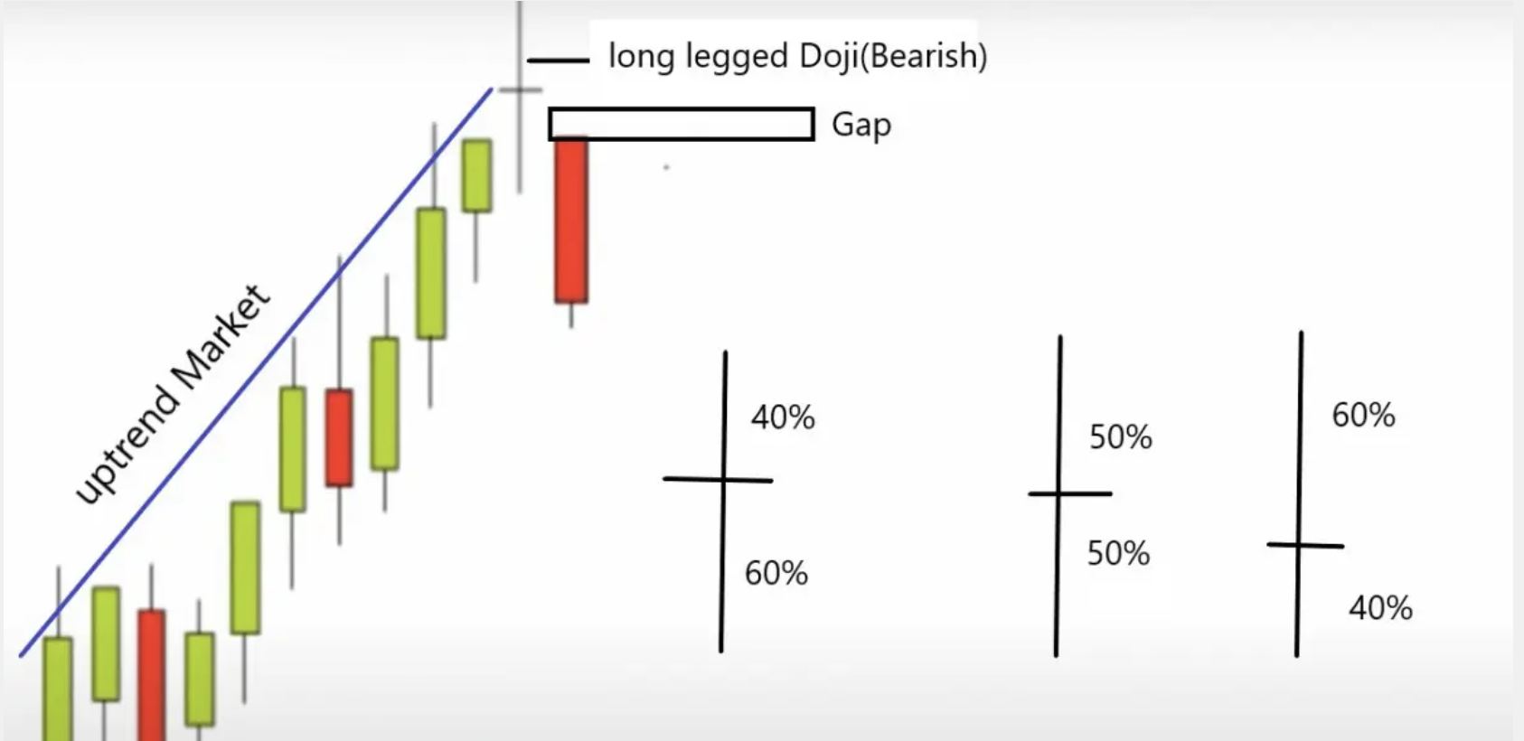 Por ejemplo, una vela Doji que se forma durante una tendencia alcista podría significar un agotamiento alcista, es decir, más compradores que se mueven hacia el lado de los vendedores, lo que normalmente conduce a un cambio de tendencia.