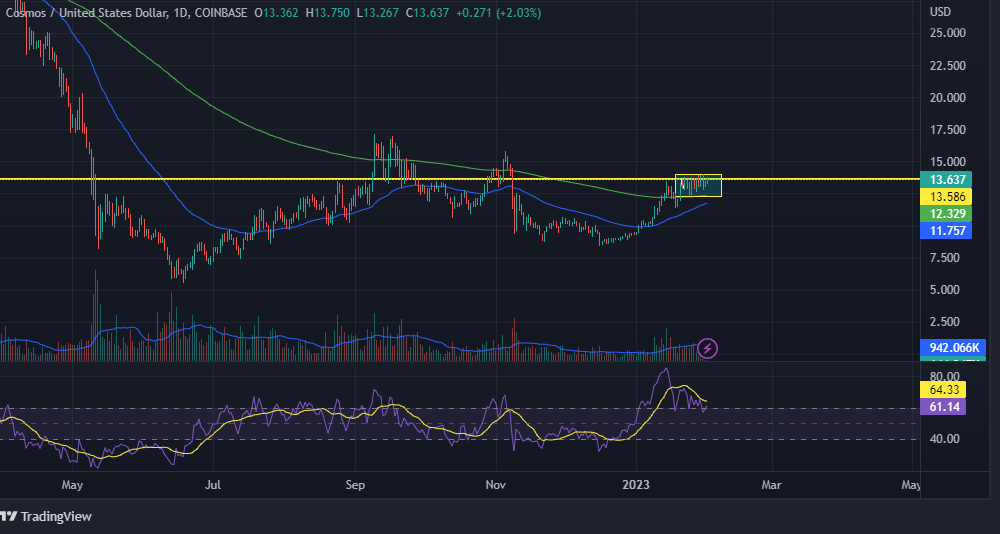 Indicador de Fuerza Relativa (RSI) – La curva RSI cotiza actualmente en 61.14, superando su umbral de 50 puntos. El aumento de Átomo la fijación de precios ha impulsado el valor de la curva RSI. La curva RSI puede continuar aumentando si el precio aumenta aún más.