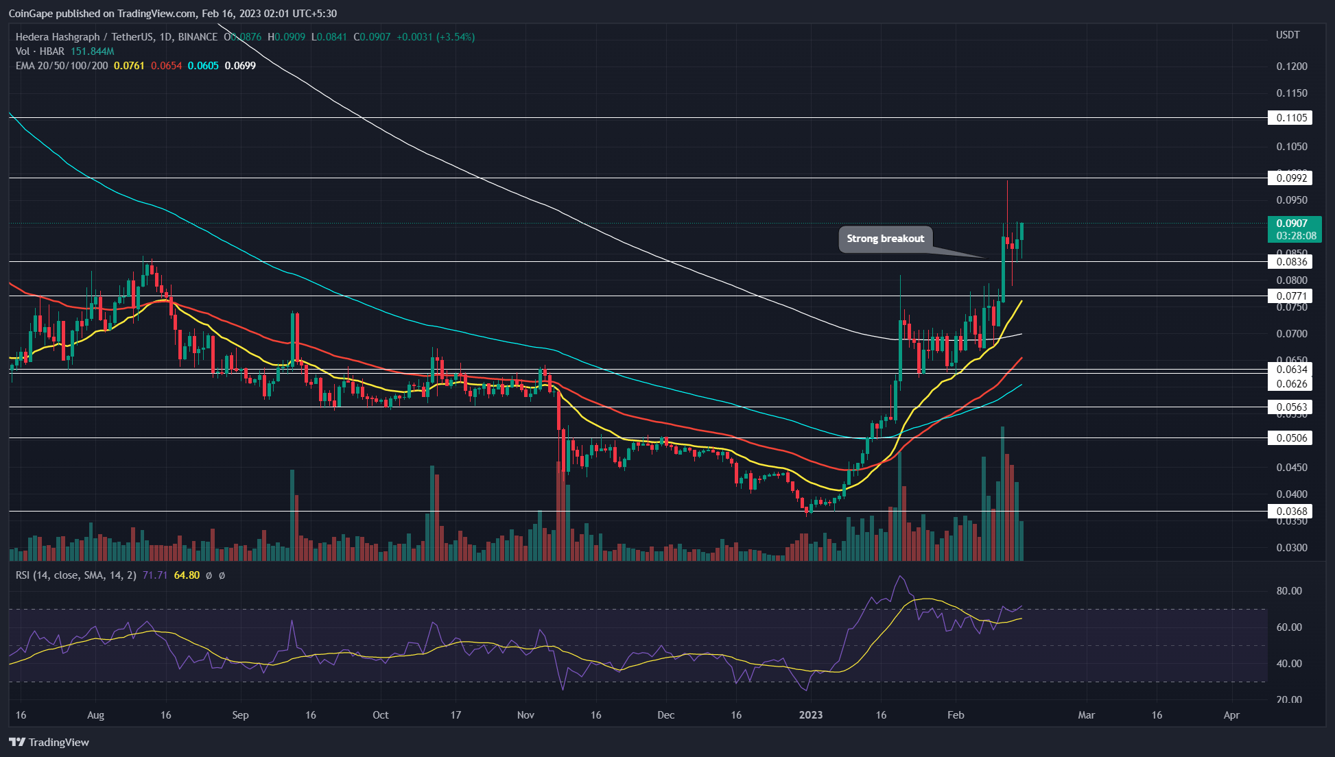 El 11 de febrero, el Precio de la moneda Hedera escapó de una fase de consolidación de tres semanas con una ruptura de $ 0.077 y $ 0.083 de resistencia horizontal. Esta ruptura ofrece a los compradores de monedas nuevos niveles de soporte para impulsar un mayor crecimiento. A partir de ahora, la altcoin pasa por una fase de nueva prueba al verificar la sostenibilidad del precio por encima de las resistencias violadas. ¿Es esta una señal de entrada?