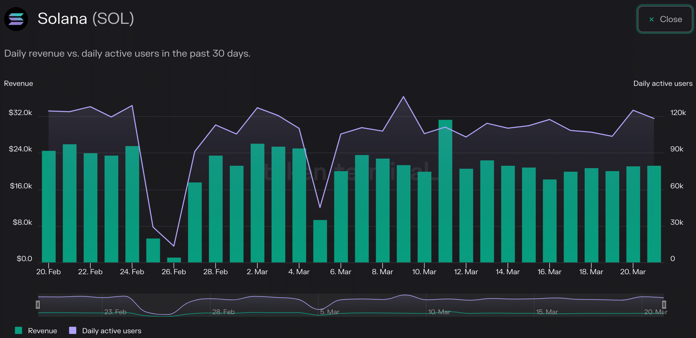 Sin embargo, a pesar del esfuerzo mostrado por estos desarrolladores, el número de usuarios activos en la red Solana ha disminuido un 17,5% en los últimos 30 días. Debido a esto, los ingresos generados por la red también cayeron un 8,2% en el mismo período, según datos de Token Terminal.