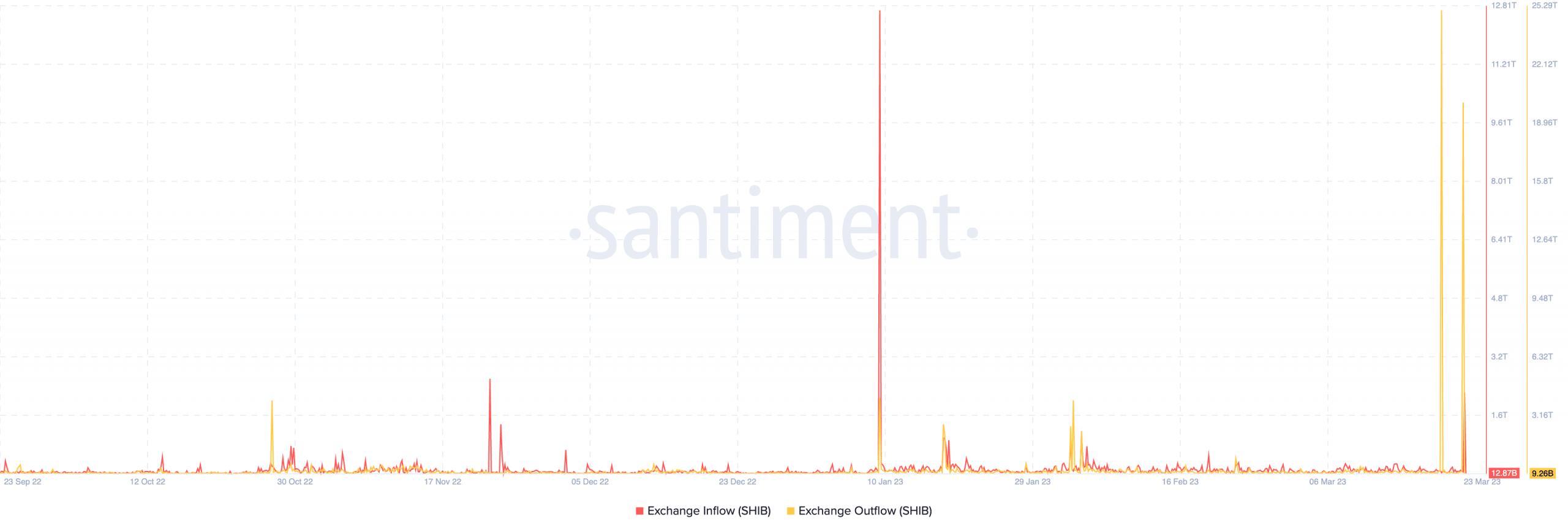 La situación en el momento de la publicación del token fue una que la criptocomunidad recibió con sorpresa. Hace solo unas semanas, la comunidad de memes estaba entusiasmada con el lanzamiento de la versión beta de Shibarium. Pero todo ese bombo se ha apagado a pesar de que el ecosistema final se ha puesto en marcha. Sin embargo, las actividades de SHIB en los intercambios han sido bastante extrañas. Según Santiment, solo unas pocas ocasiones han terminado en un pico de entrada y salida desde septiembre de 2022. Pero a partir del 23 de marzo, la entrada de intercambio SHIB alcanzó los 2,18 billones. Un valor tan alto indicaba una mayor presión de venta y una posible volatilidad para los comerciantes de derivados. Por otro lado, la salida de divisas parece haber neutralizado el efecto incluso antes del dato mencionado. El 20 de marzo, la salida de divisas fue de 24,96 billones. Tres días después, repitió una hazaña similar con 19,92 billones. A diferencia de la entrada de divisas, la salida refleja una presión de venta decreciente. Aunque ambos se habían reducido en el ínterin, la salida superó la entrada en el momento de la publicación. Esto significa que más inversores de SHIB estaban dispuestos a retener en lugar de dejar ir los tokens. Sin embargo, eso no es garantía de que evite que SHIB caiga aún más.