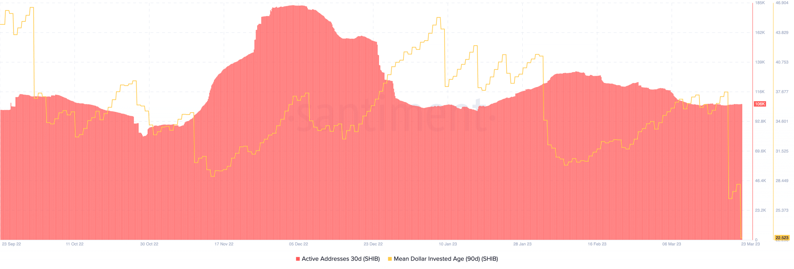 En el momento de la publicación, las direcciones activas de 30 días se redujeron a 106.000. Esto implicaba que los usuarios de SHIB habían evitado realizar transacciones con el token. Esto podría deberse al bajo rendimiento de SHIB, que se ha traducido en una caída del 18,65 % en el mismo período de tiempo. Además, la edad media de inversión en dólares durante los últimos 90 días alcanzó su punto más bajo. Con un valor de 22,52, implicaba que la cantidad media de dinero invertida en SHIB no era alentadora. Esto confirmó que estaba indeciso o completamente impresionado por la posición de SHIB.