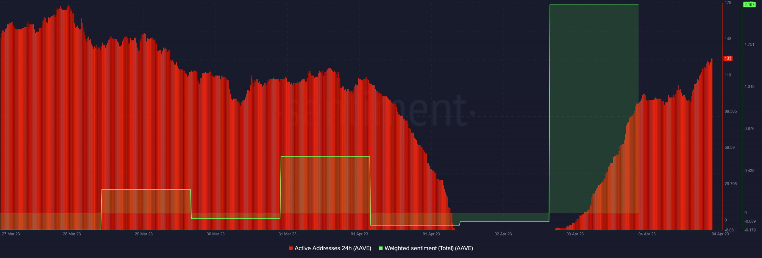Además, el Índice de Fuerza Relativa (RSI) de $AAVE indicó que el precio cruzó recientemente por encima del nivel medio, lo que sugiere un aumento en la fuerza relativa. Si bien este resultado puede apuntar a una mayor confianza entre los inversores, el sentimiento ponderado ofreció más claridad con su último repunte. El aumento del 3 de abril estuvo acompañado por un resurgimiento de las direcciones activas diarias por encima de los niveles de finales de marzo.