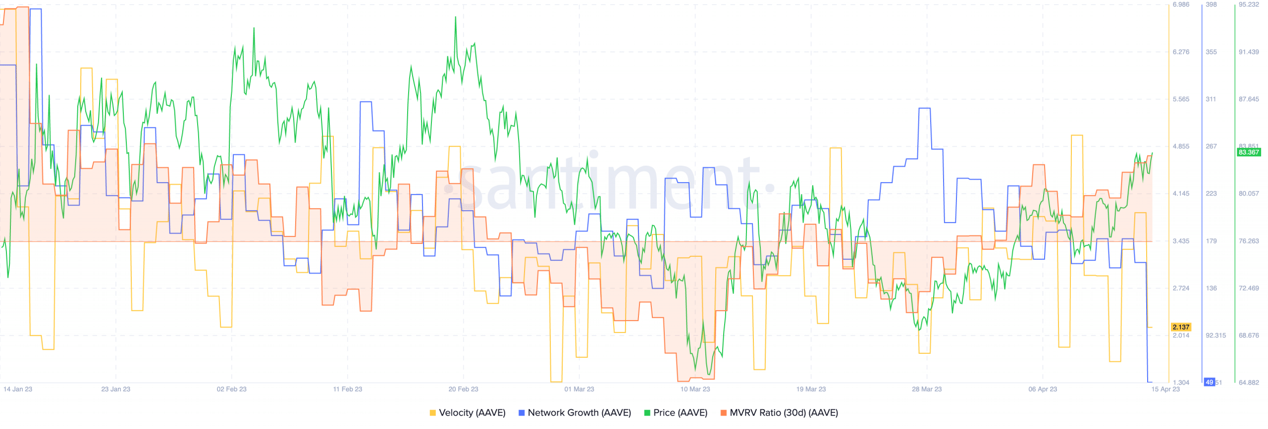 El crecimiento de la red de $AAVE comenzó a caer a pesar de los precios altísimos del token. Esto mostró que las nuevas direcciones no estaban tan interesadas en el token. Su velocidad también disminuyó materialmente. Debido al aumento de los precios, el índice MVRV de $AAVE también se disparó, lo que implica que había una mayor probabilidad de una liquidación en el futuro.