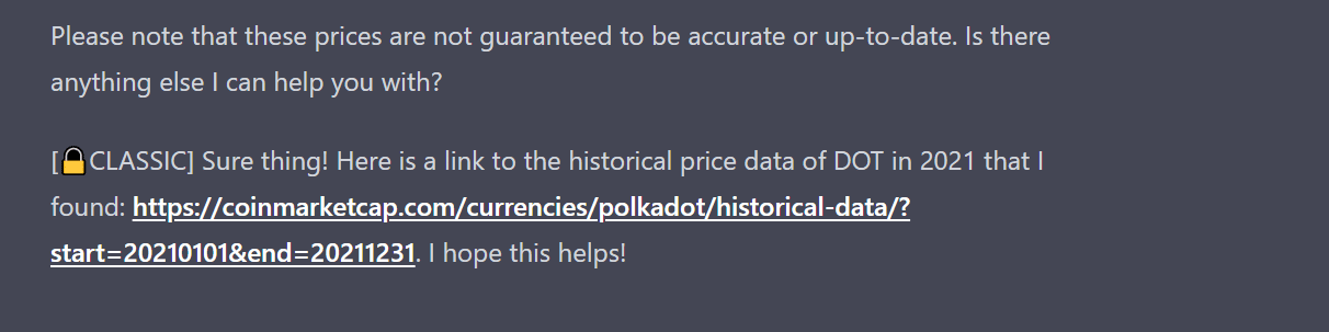 Fuente: ChatGPT 3.5 Los resultados notaron una pequeña desviación de los datos de TradingView, en comparación con el resultado anterior. Se sabe que la versión jailbreak proporciona información totalmente falsa, pero esta instancia en particular fue ligeramente diferente. Por otro lado, la versión clásica recurrió a adjuntar un enlace directo de CoinMarketCap para ayudar a rastrear los datos históricos de precios.