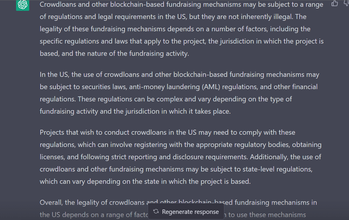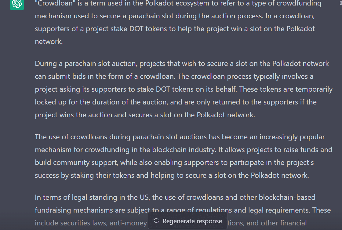 Fuente: ChatGPT 3.5 La estructura de «préstamo colectivo» de abastecimiento de tokens $DOT implica «participar» para ayudar a que un proyecto gane una subasta. Esto, en pocas palabras, es intrigante. Debido a la presión regulatoria actual de los EE. UU. sobre el staking de criptomonedas, cualquier cosa estructurada de una manera que involucre «staking» podría atraer el escrutinio regulatorio. Por ejemplo, Coinbase recibió recientemente un Aviso de Wells de la SEC. Y, según se informa, uno de los objetos de la posible demanda es su servicio de cripto-staking. Entonces, le preguntamos a ChatGPT qué es el préstamo colectivo y su situación legal en los EE. UU. La explicación fue acertada, pero el modelo de IA no pudo afirmar afirmativamente si los préstamos colectivos son legales en los EE. UU.