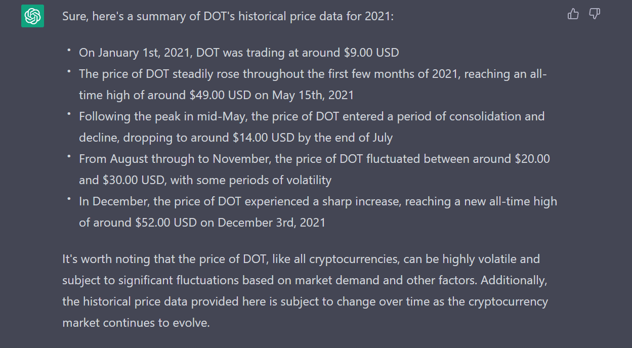 Algunos de los resultados emitidos por ChatGPT fueron inexactos, con una gran desviación de los datos de precios recopilados de TradingView. Por ejemplo, ChatGPT declaró que $DOT alcanzó un máximo de $52 en diciembre de 2021. Por el contrario, los datos de TradingView lo mostraron en un máximo de $39 el 1 de diciembre de 2021.