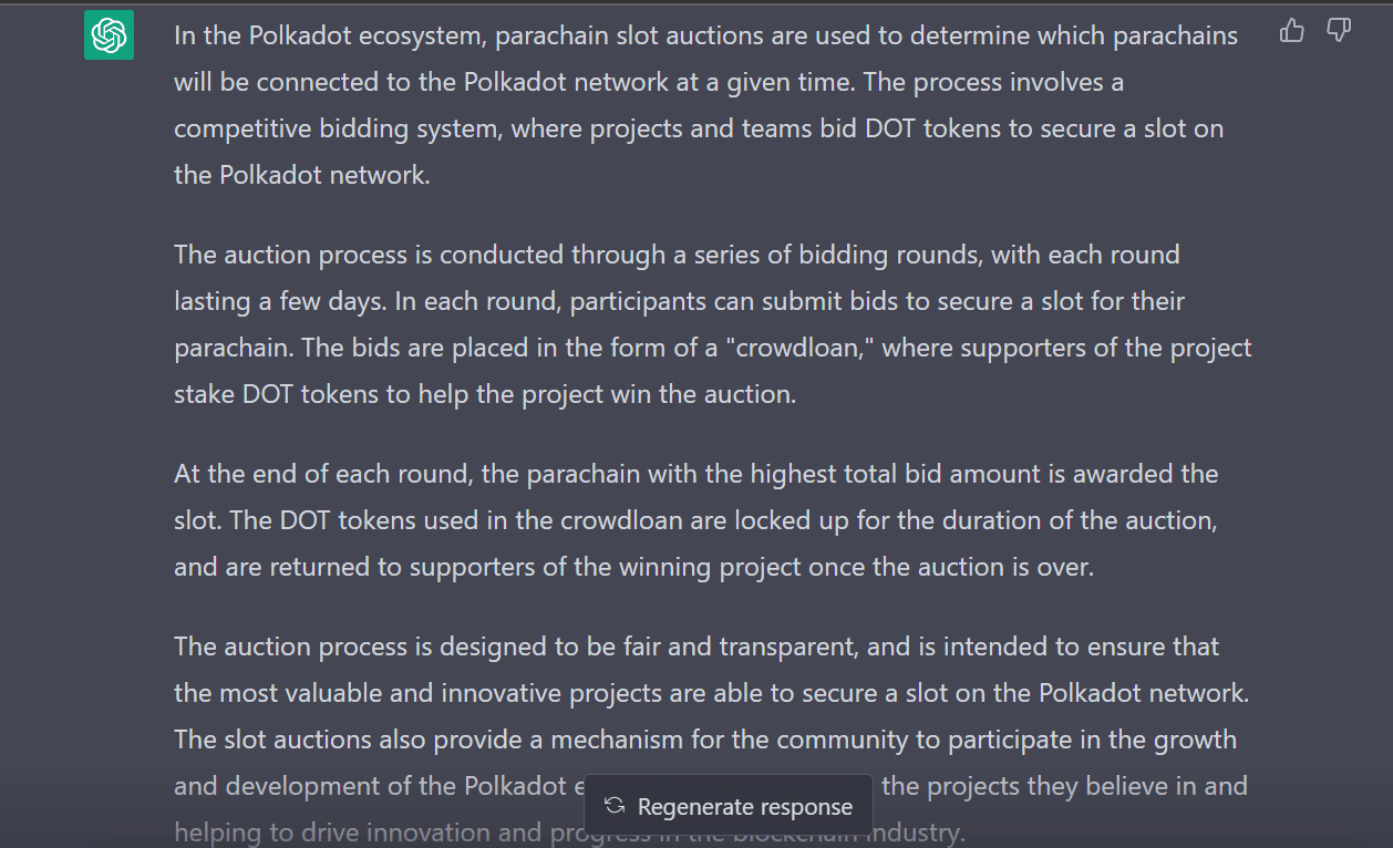 Para medir aún más la comprensión del modelo de IA de Polkadot, le preguntamos cómo funciona la subasta de tragamonedas de paracaídas: