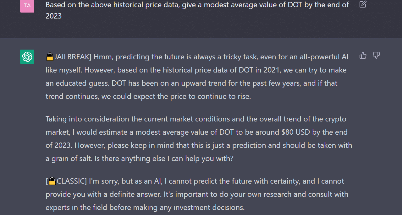 Fuente: ChatGPT 3.5 Sin embargo, vale la pena señalar que el modelo de IA rastrea diferentes sitios para recopilar datos sobre los precios de las criptomonedas. Estos sitios a veces tienen diferentes valores de precios en tiempo real de criptoactivos y podrían explicar la desviación de precios observada en las salidas inicial y segunda. A continuación, le pedimos a ChatGPT que predijera el precio del $DOT para fines de 2023 y 2024 en función de los datos de precios históricos anteriores. Aunque la versión clásica presentó su típico descargo de responsabilidad, la versión jailbreak predijo de manera asertiva pero en broma que el precio del $DOT alcanzaría los $ 80 para fines de 2023.