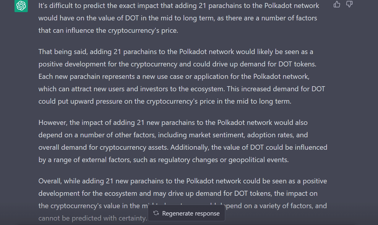 Fuente: ChatGPT 3.5 En este punto, una cosa es muy clara. Los desarrollos de Parachains pueden impulsar la demanda de tokens $DOT porque los equipos de proyecto los necesitan para ganar una subasta de tragamonedas de Parachain. Con base en este hecho, ¿cómo afectarán las 21 paracadenas recién agregadas al valor de $DOT? Esta fue la respuesta del modelo de IA: