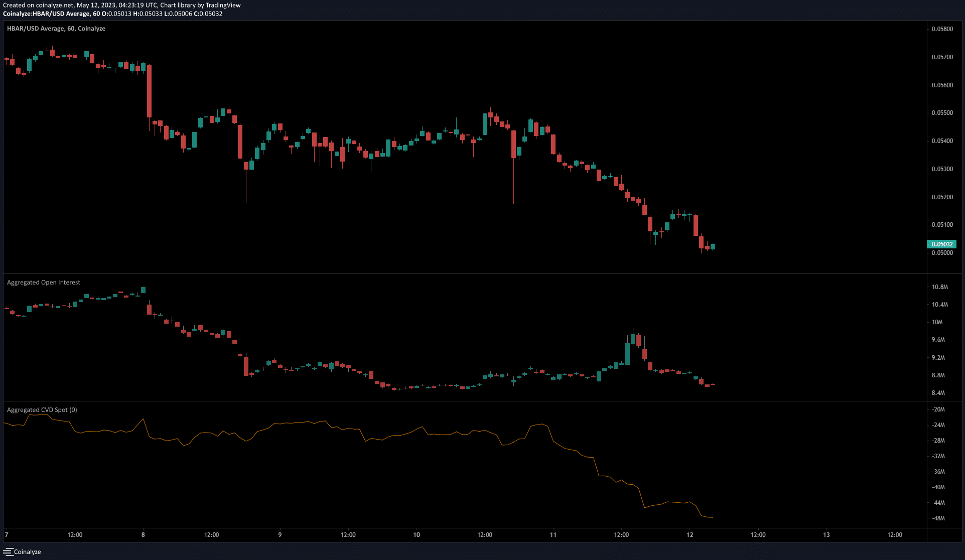 Fuente: Coinalyze Los datos de Coinalyze revelaron que los especuladores eran extremadamente bajistas en HBAR. El 11 de mayo, cuando los precios cayeron por encima de la marca de $0,052, el interés abierto aumentó cerca de $8 millones. Los días 9 y 10 de mayo, los operadores de futuros estuvieron tranquilos y el sentimiento no favoreció a los vendedores con tanta fuerza como el jueves. El CVD al contado también cayó en picado el 11 de mayo, reflejando una vez más una intensa presión de venta. En conjunto, los gráficos de plazos más bajos y el sentimiento fueron bajistas. Sin embargo, es posible que el nivel de $ 0.05 pueda ver un pequeño rebote en los precios de HBAR antes de otro movimiento hacia el sur.