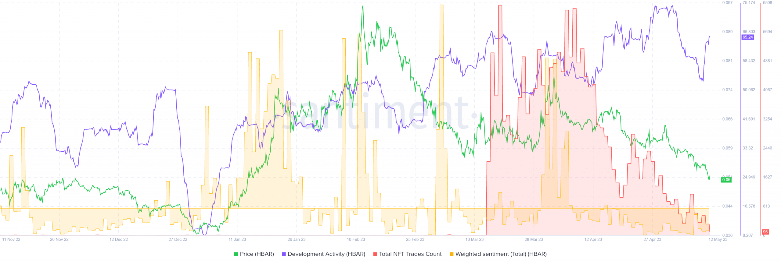 El RSI cayó a 27 para mostrar una enorme presión bajista. Sin embargo, el OBV no experimentó grandes pérdidas. En cambio, continuó defendiendo un nivel de soporte desde principios de febrero. Este volumen de venta sugerido podría no ser tan expansivo como mostraban los gráficos de precios e insinuaba una posible recuperación si se detenía el sentimiento bajista del mercado. Hacia el sur, el nivel de $ 0.044 fue un nivel de soporte de marco de tiempo más alto que podría ver un rebote en los precios de HBAR. La marca de $0.05 también ha sido importante. Esto se destacó en noviembre de 2022 cuando los toros HBAR lucharon por romper la resistencia de $ 0.05. El aumento de la actividad de desarrollo da esperanza a los inversores