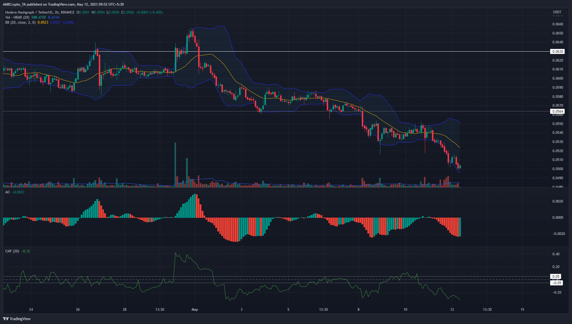 Fuente: HBAR/USDT en TradingView El gráfico de 2 horas mostró que la estructura del mercado de plazos más bajos también era bajista. Destacó los intentos de los alcistas de mantener el nivel de soporte de $0,056 en mayo. Se agotaron el 8 de mayo y el rápido movimiento hacia el sur dejó un desequilibrio en torno al área de $0,056-$0,056. La zona de $0,53-$0,54 actuó como soporte brevemente, pero también fue cedida. Las Bandas de Bollinger estaban muy separadas para reflejar la volatilidad de los últimos dos días. El precio abrazó la más baja de las dos bandas, mientras que el Awesome Oscillator notó barras rojas en su histograma durante las últimas 24 horas. Los gráficos de 2 horas encontraron que $0.05 se probó previamente como soporte el 15 de enero. Detuvo el fuerte repunte durante unas horas, pero finalmente fue dominado. Este podría ser el caso en el camino hacia abajo también.
