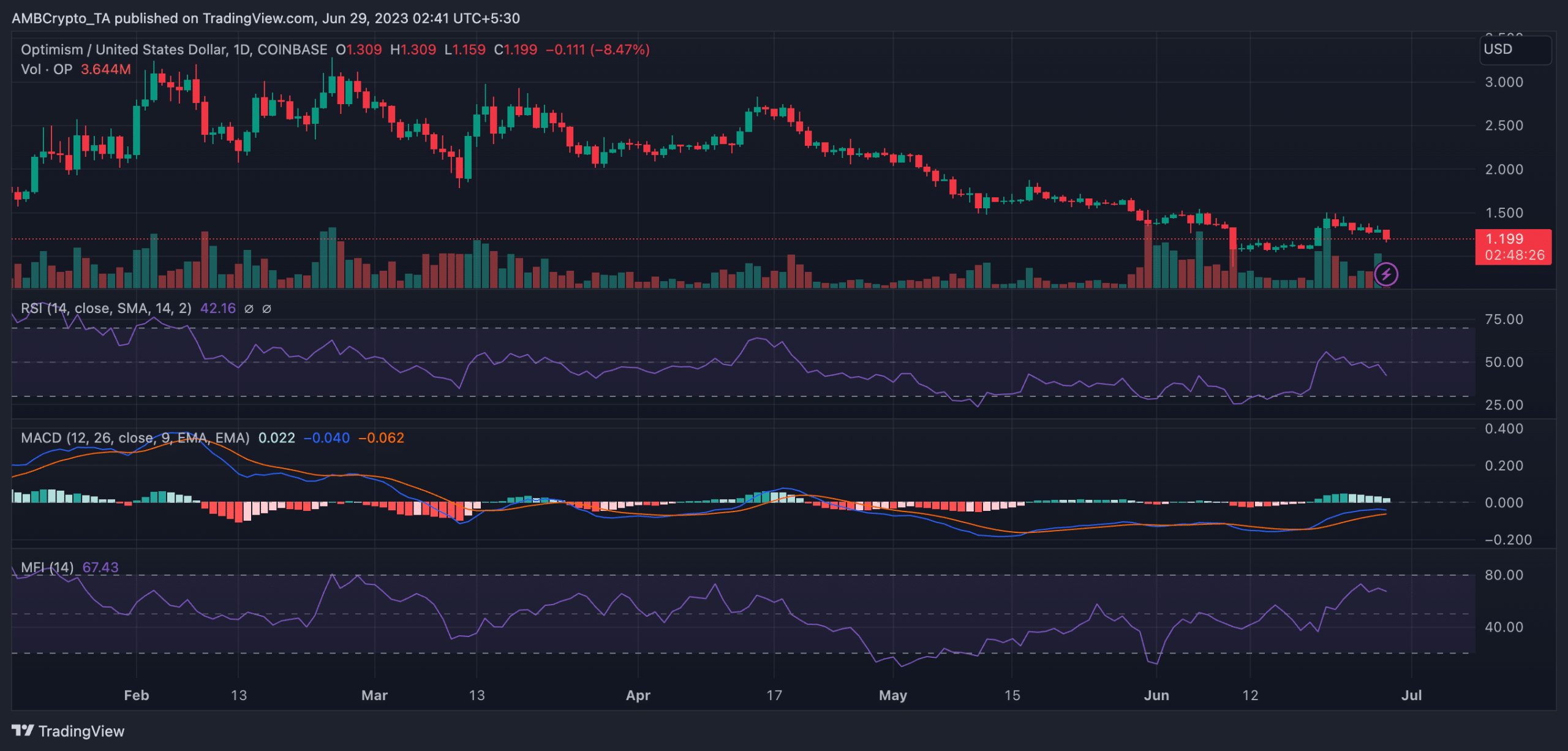 Además de los datos mencionados anteriormente, una mirada al gráfico diario de OP también dio una idea clara de lo que se puede esperar de la altcoin. OP estaba intercambiando manos a $ 1.199 en el momento de escribir este artículo. El token se negoció un 8% por debajo de su precio de apertura del día. Además, el Índice de Fuerza Relativa (RSI), aunque en 42.16, se vio en una posición descendente.