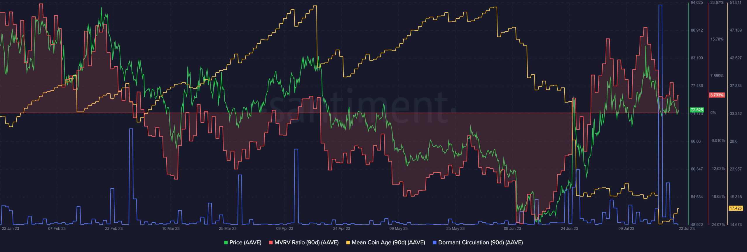 Fuente: Santiment Desde el 9 de junio, la edad media de las monedas de 90 días ha caído como una roca. Esto demostró que los tenedores de fichas estaban vendiendo y no acumulando $AAVE. Este argumento no está respaldado por la acción del precio de las últimas seis semanas. La relación MVRV mostró que ha habido una ola de toma de ganancias durante la última semana. Esto estuvo acompañado por un aumento masivo en la circulación inactiva, lo que indicó que se produjo una gran ola de ventas. Si $AAVE puede defender la zona de soporte de $ 70 en los próximos días, sería cada vez más probable otro movimiento al alza.