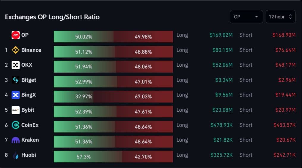 Los datos de Coinglass capturaron un sesgo alcista creciente en el mercado de futuros. En cuanto a la relación cambiaria largo/corto, las posiciones largas mantuvieron una ligera ventaja del 50,02% ($169,02 millones) frente al 49,98% ($168,90 millones) de las posiciones cortas. Sin embargo, el diferencial de 102.000 dólares entre ambas posiciones destacó la tendencia de los precios a oscilar en cualquier dirección con poca antelación. Esto hace que sea fundamental para los operadores de OP realizar un seguimiento constante de la acción del precio de BTC antes de abrir nuevas posiciones.