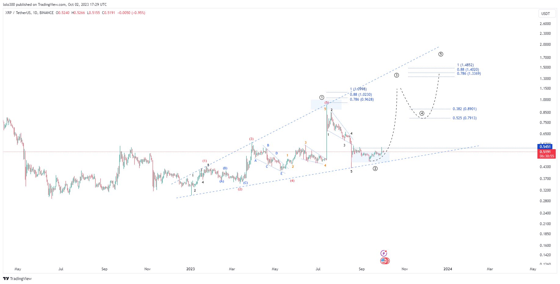 Los comentarios sobre el análisis de Egrag fueron multifacéticos. @300Mill300, una voz destacada en el espacio criptográfico, extrapoló el análisis inicial de Egrag y ofreció un gráfico alcista para XRP. Proyectó un repunte hasta 1,15 dólares a principios de 2024, seguido de una breve retracción hasta 0,79 dólares y un posterior aumento alcista hasta alcanzar 1,40 dólares a finales de 2024.