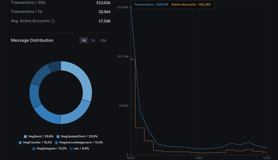 Periodista Publicado: 17 de noviembre de 2023 Las cuentas activas y las transacciones cayeron a pesar del aumento de precios de TIA. Los participantes del mercado parecen preferir comprar el token en las bolsas. El precio de Celestia [TIA] alcanzó un nuevo máximo el 15 de noviembre, cuando el valor se disparó a 6,52 dólares. El aumento del valor representó un aumento del 4,79% en las 24 horas y un aumento acumulado del 196,24% en los últimos 30 días. Como resultado, la capitalización de mercado del proyecto Celestia llegó al número 60. El desempeño de TIA desde su lanzamiento ha sido nada menos que impresionante. Si bien ha habido retrocesos, el token parece comprometido con su modelo de descubrimiento de precios, como informó anteriormente CriptoPasion. Para quienes no están informados, el descubrimiento de precios está impulsado en gran medida por la oferta y la demanda. Para un token como TIA, el aumento en el valor, incluso cuando el mercado en general tuvo un período de «desaceleración», significa que los compradores y vendedores aún no han encontrado un precio aceptable que se adapte a ambas partes. El precio no siempre es una señal saludable. Sin embargo, la acción del precio de TIA no pareció tener un efecto general positivo en la red Celestia. Esto se debió a las indicaciones mostradas por Mintscan, según lo evaluado por CriptoPasion. Según los datos considerados, se han producido un total de 32.064 transacciones en la cadena Celestia en las últimas 24 horas.