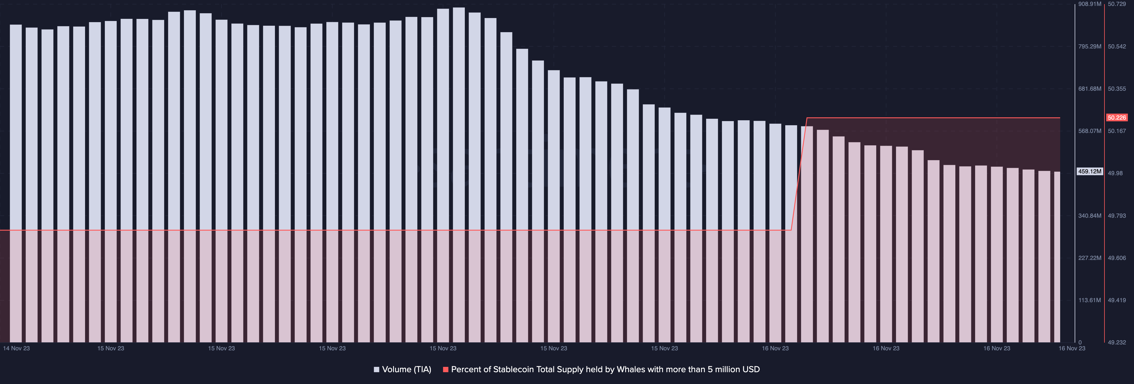 Fuente: SantimentCon respecto a esto, CriptoPasion verificó el suministro de ballenas estables. Al momento de escribir este artículo, el suministro de ballenas de moneda estable en dirección a TIA se había estancado, lo que indica que los grandes inversores pueden haber decidido ser espectadores por el momento.