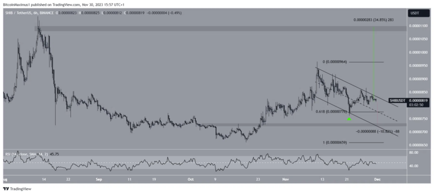 El marco de tiempo de seis horas da una lectura similar mixta. El precio de SHIB ha caído dentro de un canal paralelo descendente desde el 11 de noviembre, un patrón típicamente asociado con movimientos correctivos.