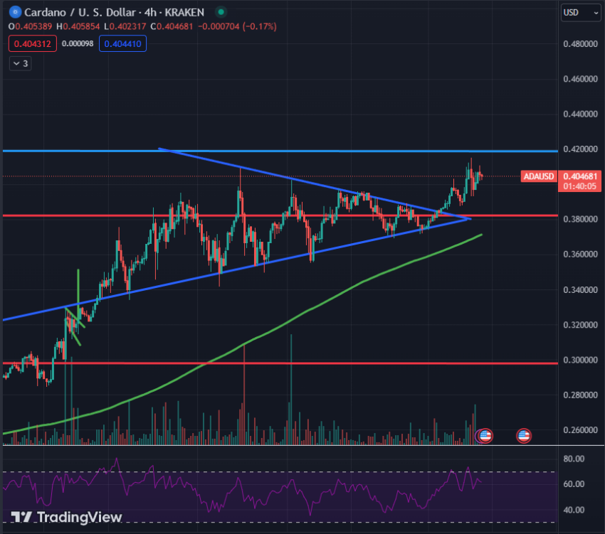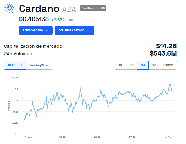 A principios del mes de noviembre, el precio de Cardano cotizaba en aproximadamente 0.320 dólares. Al momento de la publicación, ADA se encuentra cotizando en 0.402 dólares, experimentando un aumento del 254% durante los últimos 30 días, según datos de BeInCrypto.