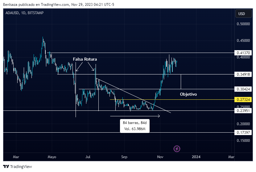 Benjamín Isaza, trader y analista de BeInCrypto, señala que, en el corto plazo Cardano -a modo de retroceso- puede volver al nivel de los 0.3 dólares: