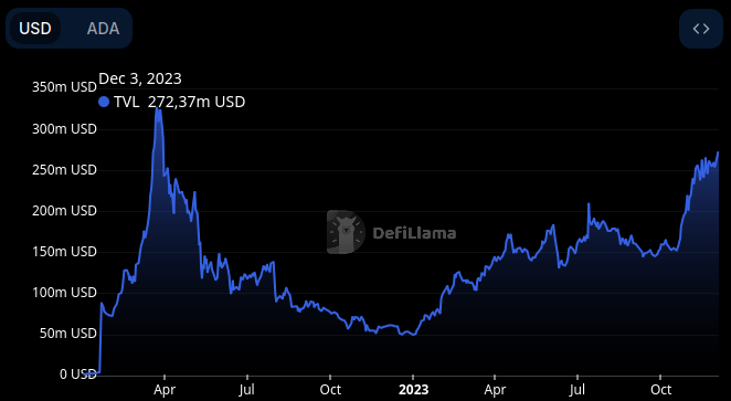 Al mismo tiempo, el valor total bloqueado (TVL) de Cardano en DeFi se ubica actualmente en 272,3 millones de dólares, registrando un nuevo máximo anual, de acuerdo a datos de DefiLlama.