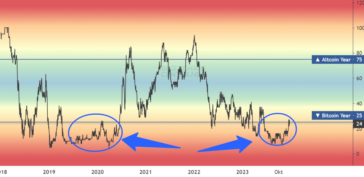 Esto significa que el sufrimiento de las altcoins frente a Bitcoin, que duró unos 2 años, podría terminar pronto. Si este indicador a largo plazo se comporta de manera similar, como lo hizo en 2020, se puede esperar una fuerte altseason en 2024.