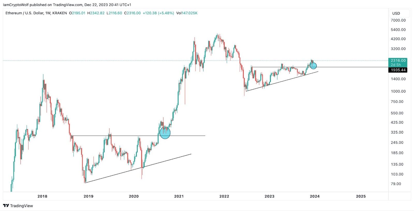 Si Ethereum logra mantener el nivel de 1,935 dólares y validarlo como soporte, podría iniciarse un movimiento exponencial al alza. Si se repite el escenario del mercado alcista anterior, ETH podría experimentar un repunte en los próximos 18 meses.