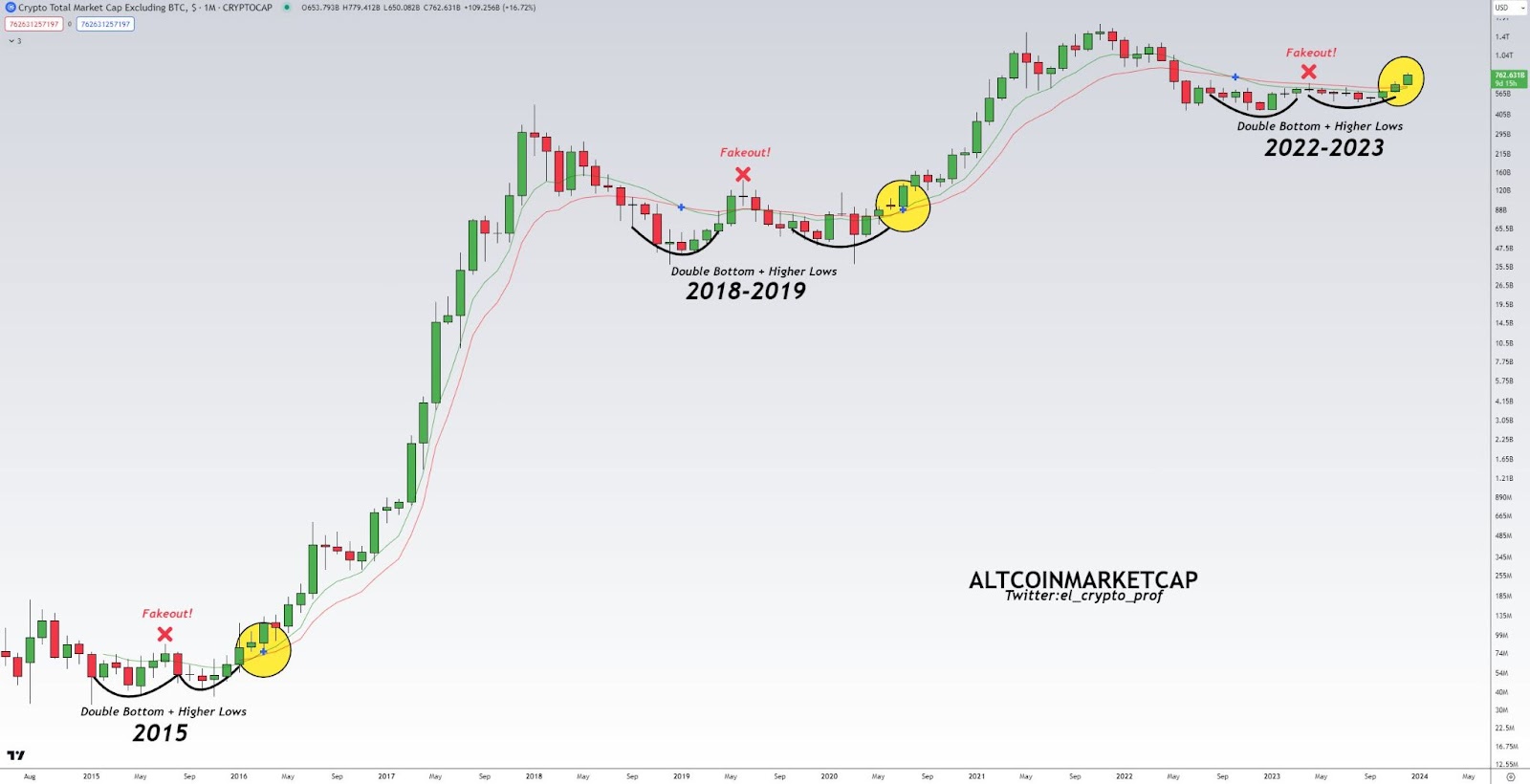 Señaló que esta es la tercera vez en la historia que la capitalización de las altcoins ha generado un doble fondo con un mínimo más alto y una falsa ruptura.