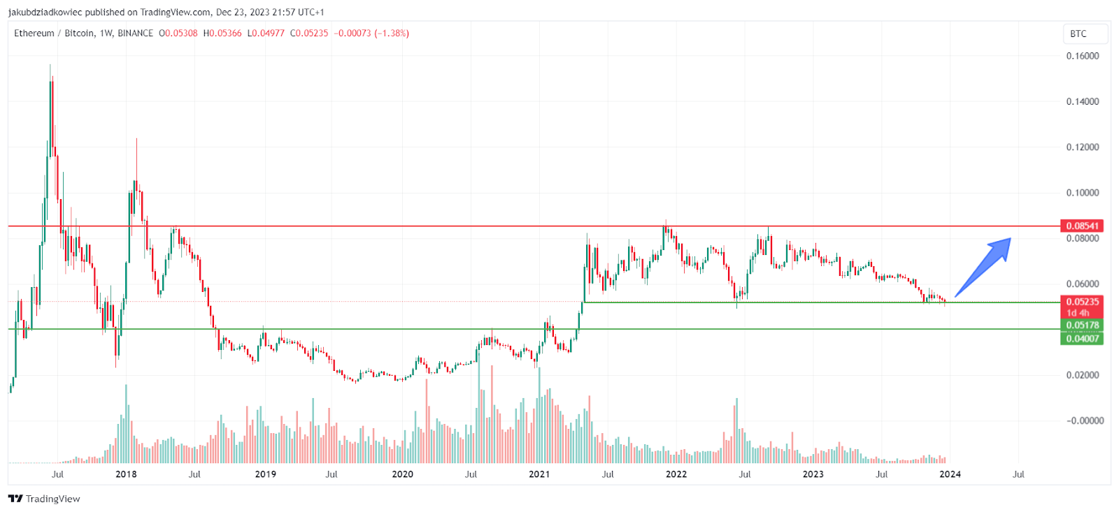 Finalmente, la última señal a favor de la altseason es el gráfico del precio del propio Ethereum (ETH). A pesar del hecho de que el par ETH/BTC se encuentra actualmente en un mínimo a largo plazo, podría ser un momento ideal para tomar una posición larga aquí.