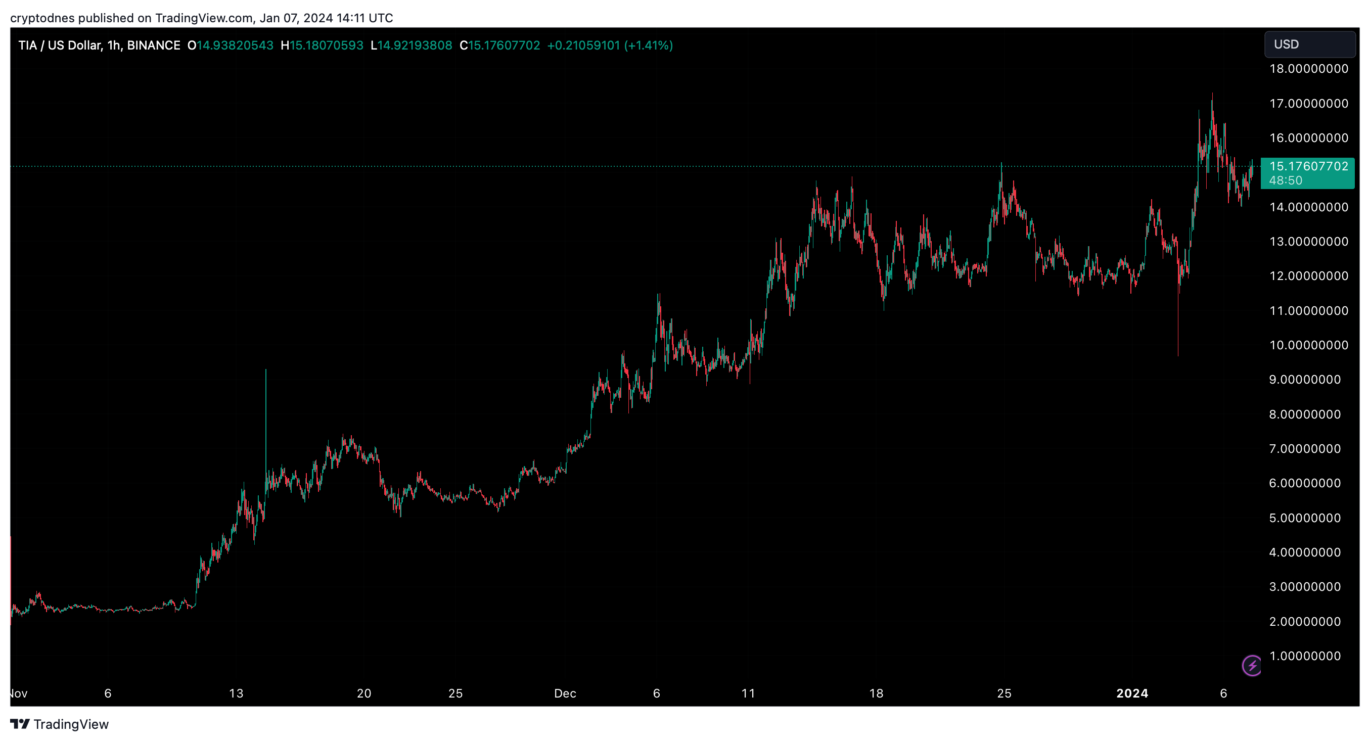 Desde principios de noviembre, el precio de Celestia (TIA) ha aumentado constantemente y recientemente alcanzó un máximo histórico de 16.8 dólares.