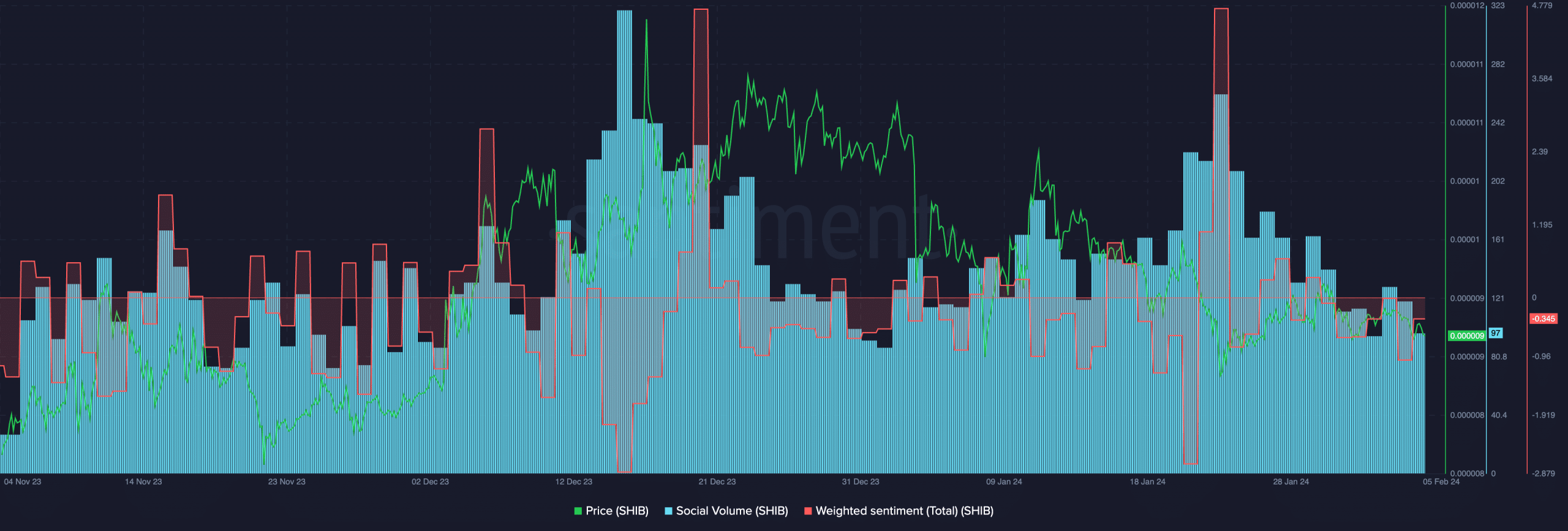 Sin embargo, el sentimiento ponderado había disminuido, lo que sugiere que había una perspectiva negativa hacia $SHIB en las plataformas de redes sociales.