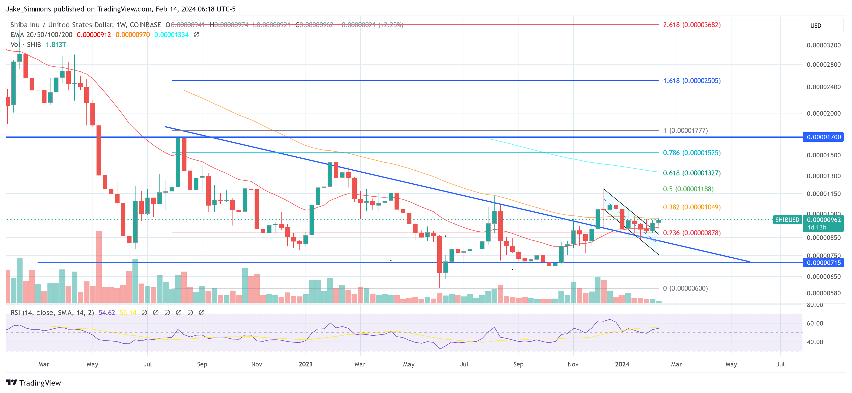 En el gráfico semanal, el RSI aquí también indica un impulso neutral. El gráfico semanal $SHIB/USD muestra la ruptura de un patrón de triángulo descendente a principios de diciembre de 2023, seguida de una nueva prueba exitosa a finales de enero de este año. El RSI semanal se encuentra ahora en territorio neutral (en 54,6), listo para un nuevo repunte.